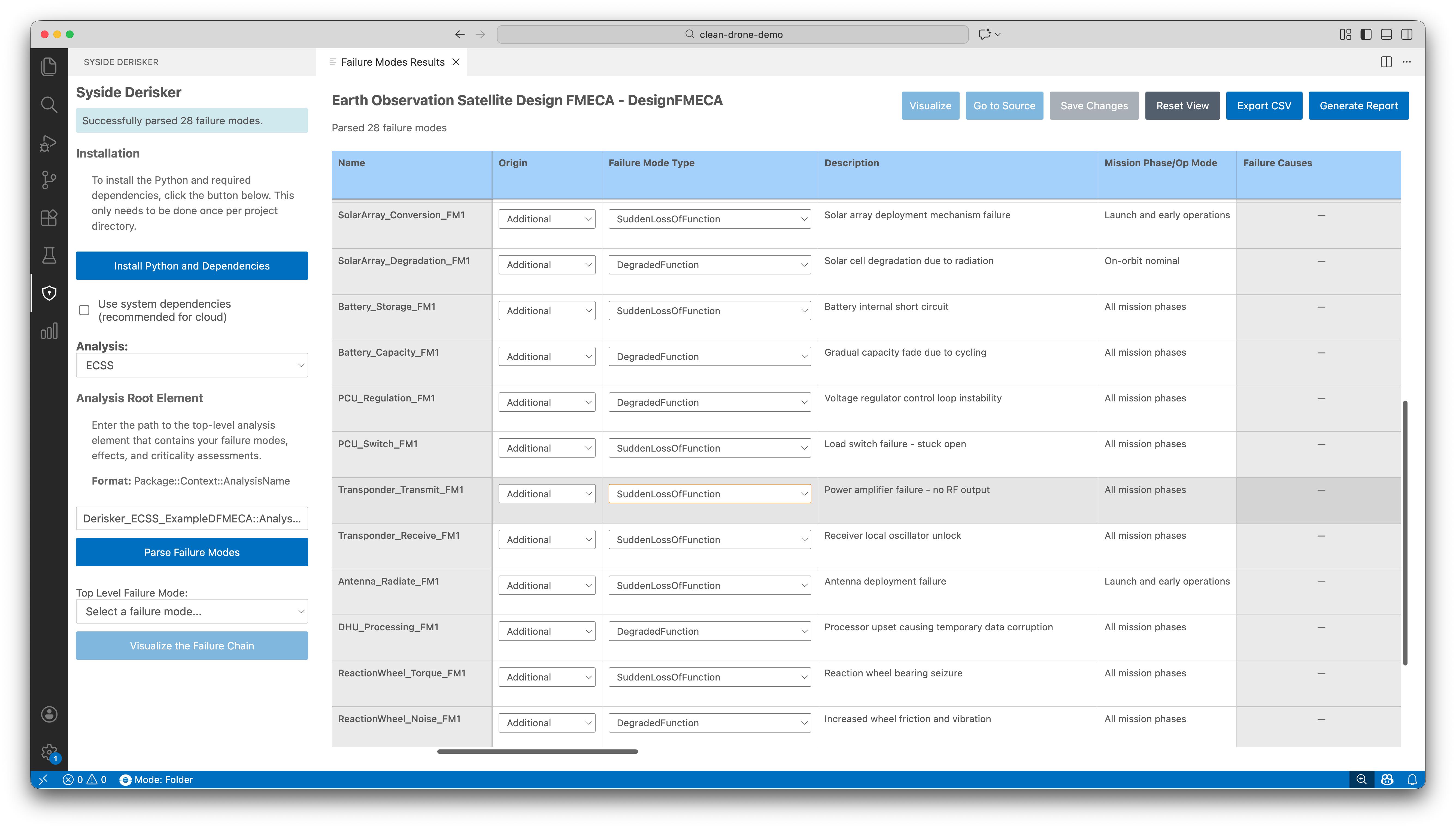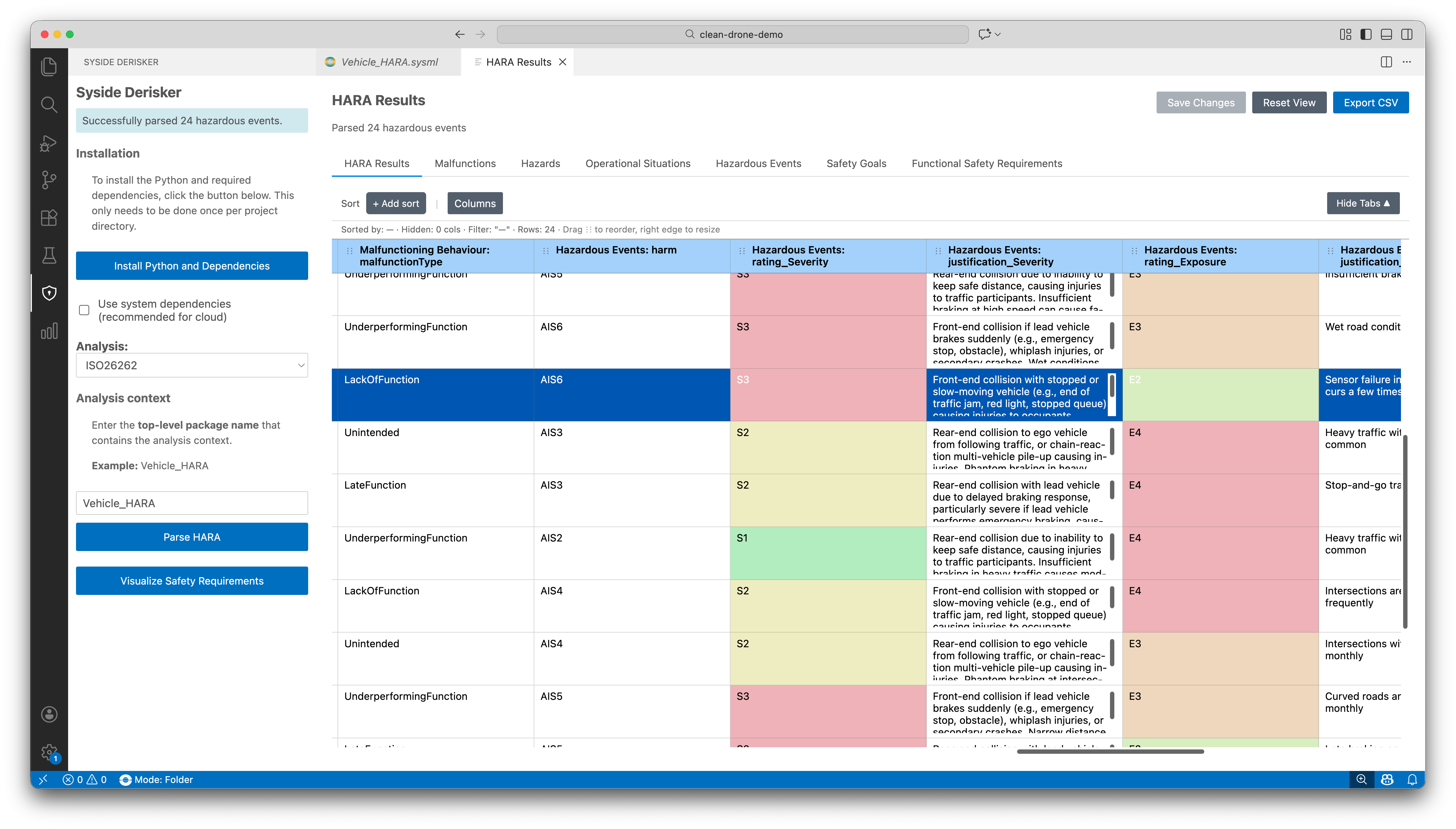 By selecting the desired standard and entering the required information, Derisker parses the SysML v2 model, validates it, and displays the results in specialized table views. The parser checks for missing or incomplete elements, detects invalid relationships (such as cycles in failure chains), and automatically computes derived values.