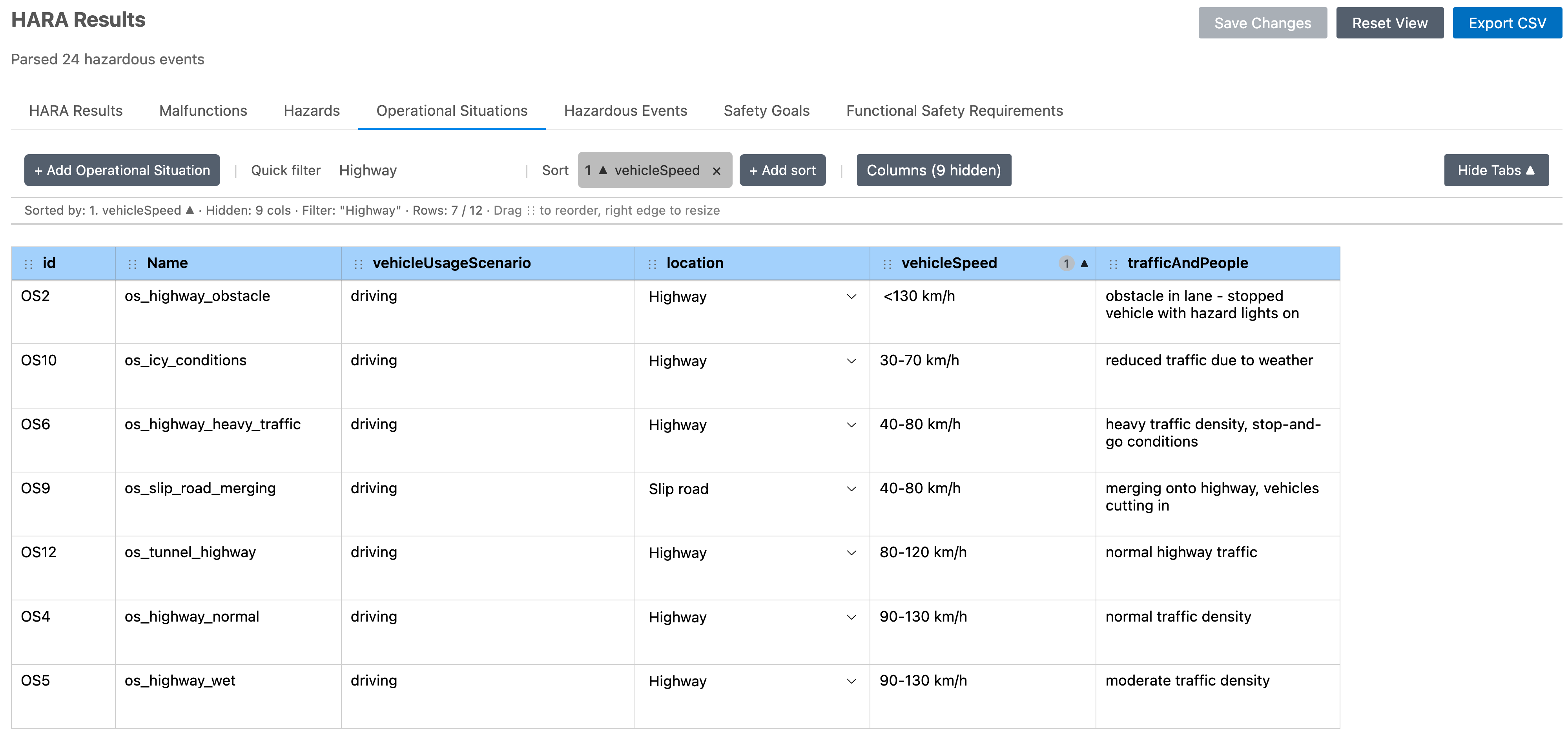Operational Situations: An editable table view of the Operational Situations of the HARA analysis.