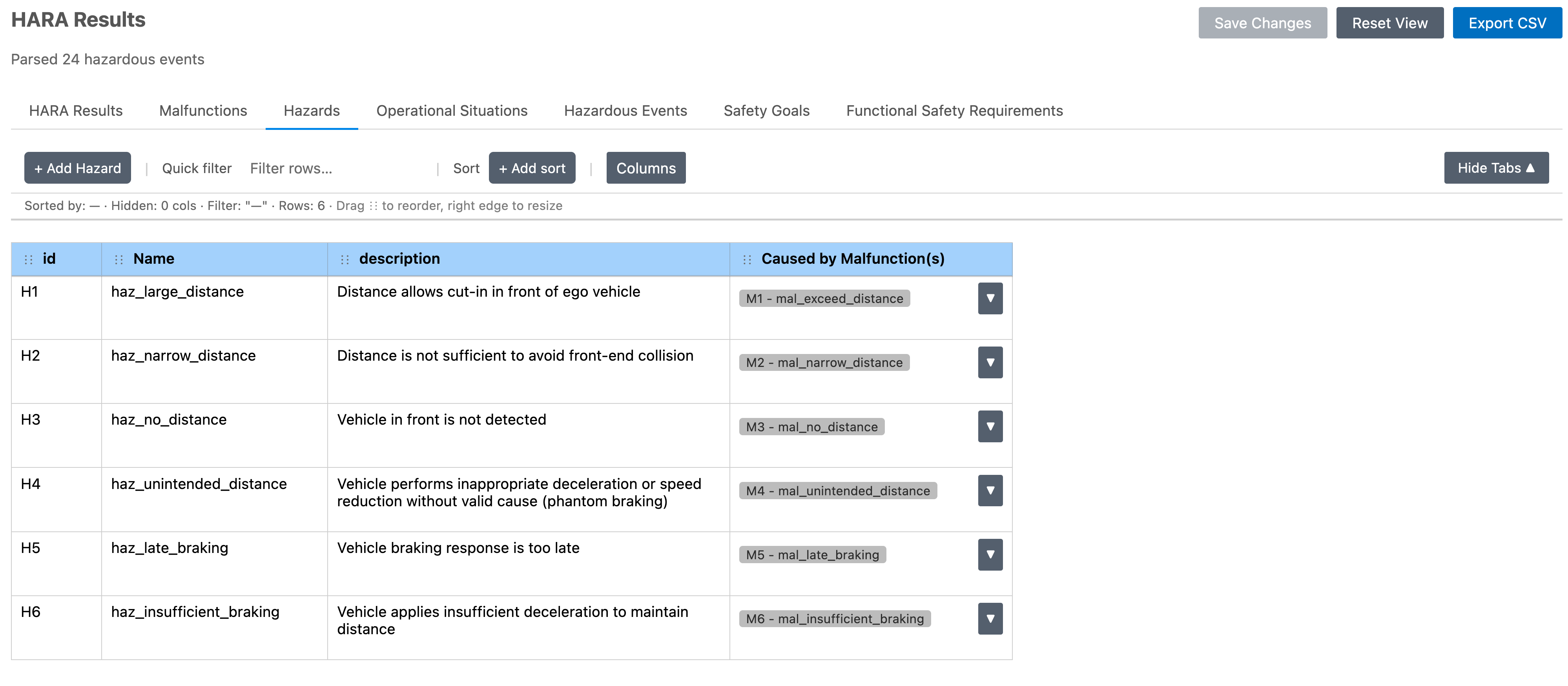 Hazards: An editable table view of the Hazards of the HARA analysis.