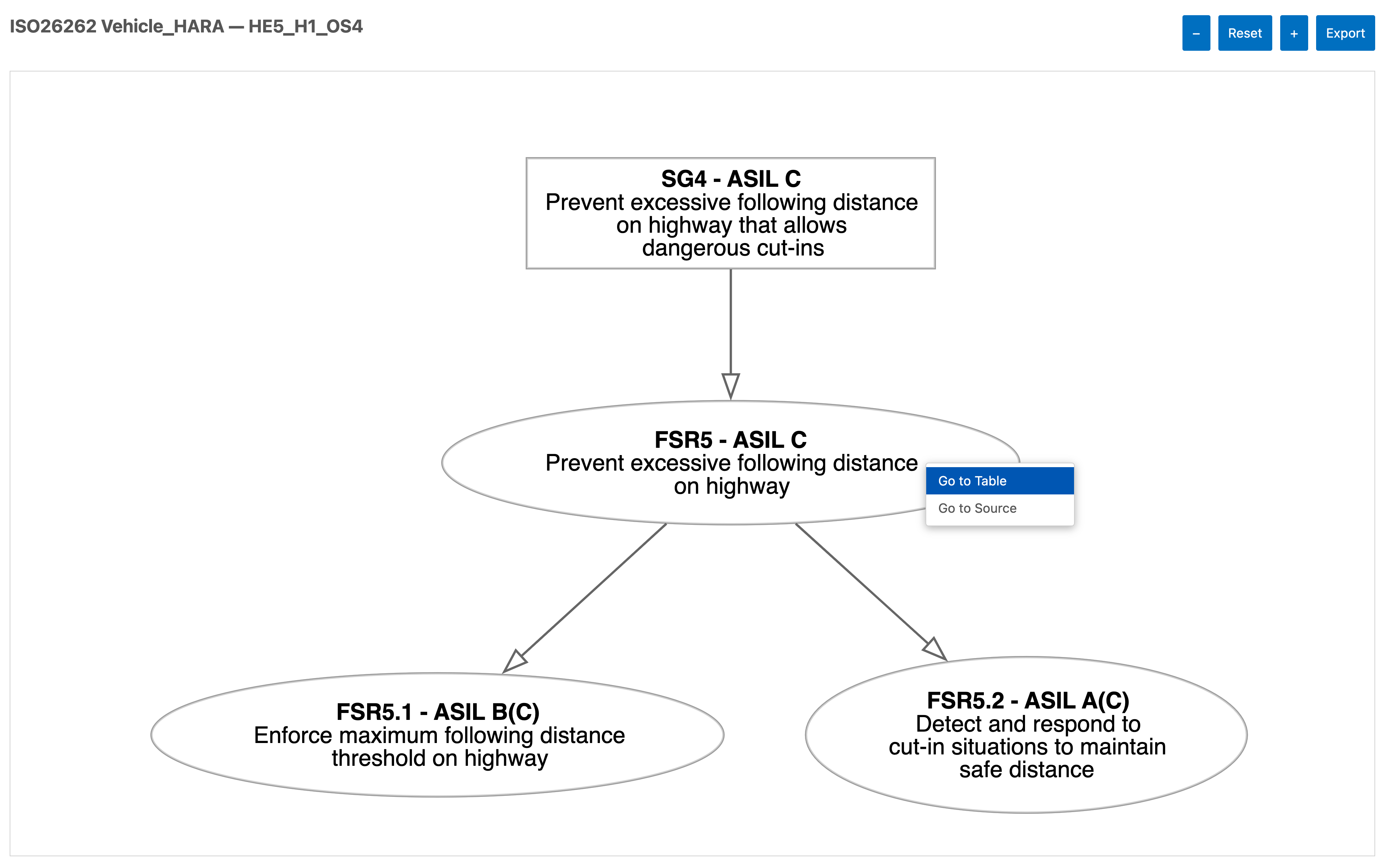 Understand relationships between Safety Goals and Functional Safety Requirements with an interactive graph visualization.